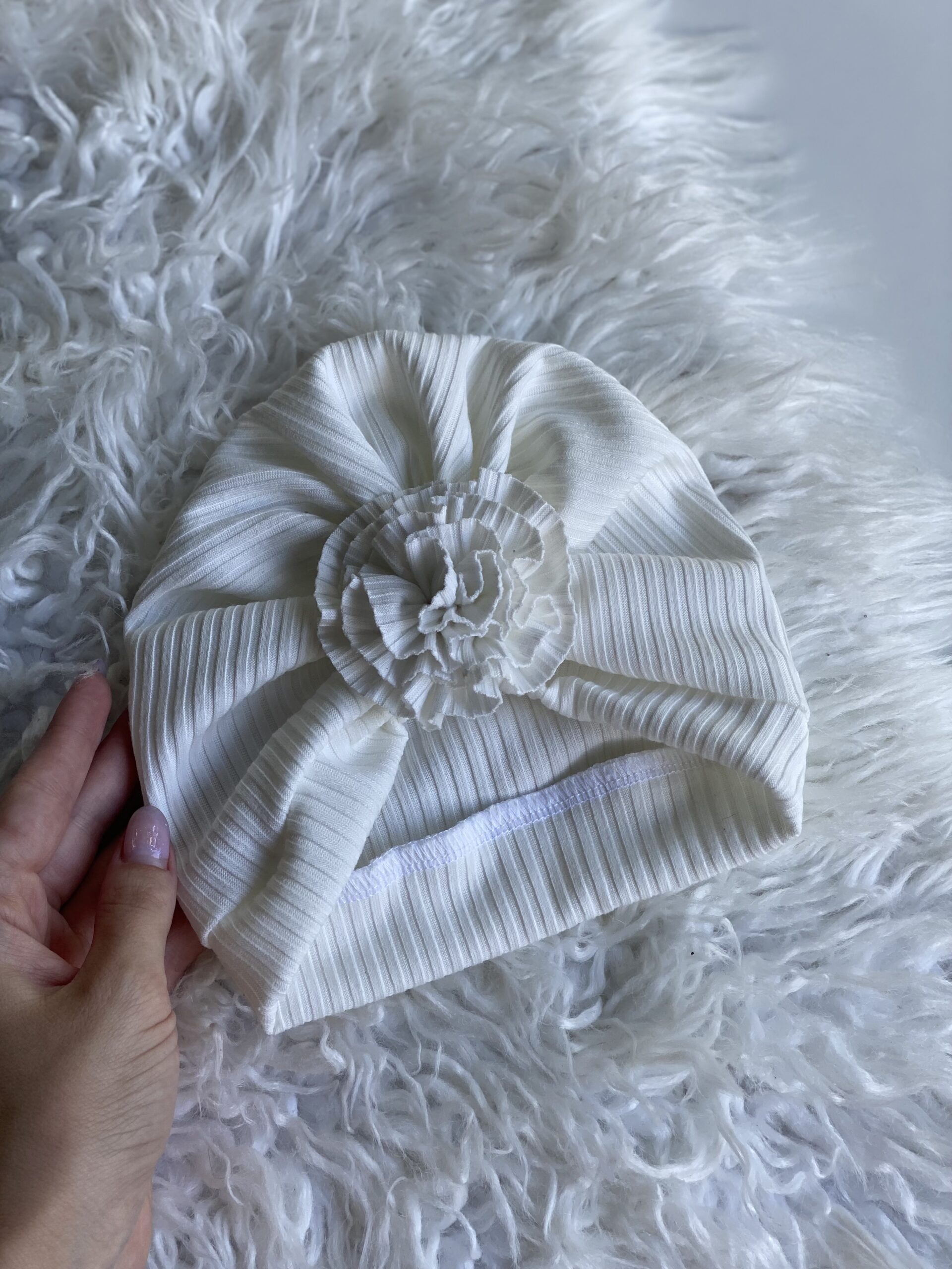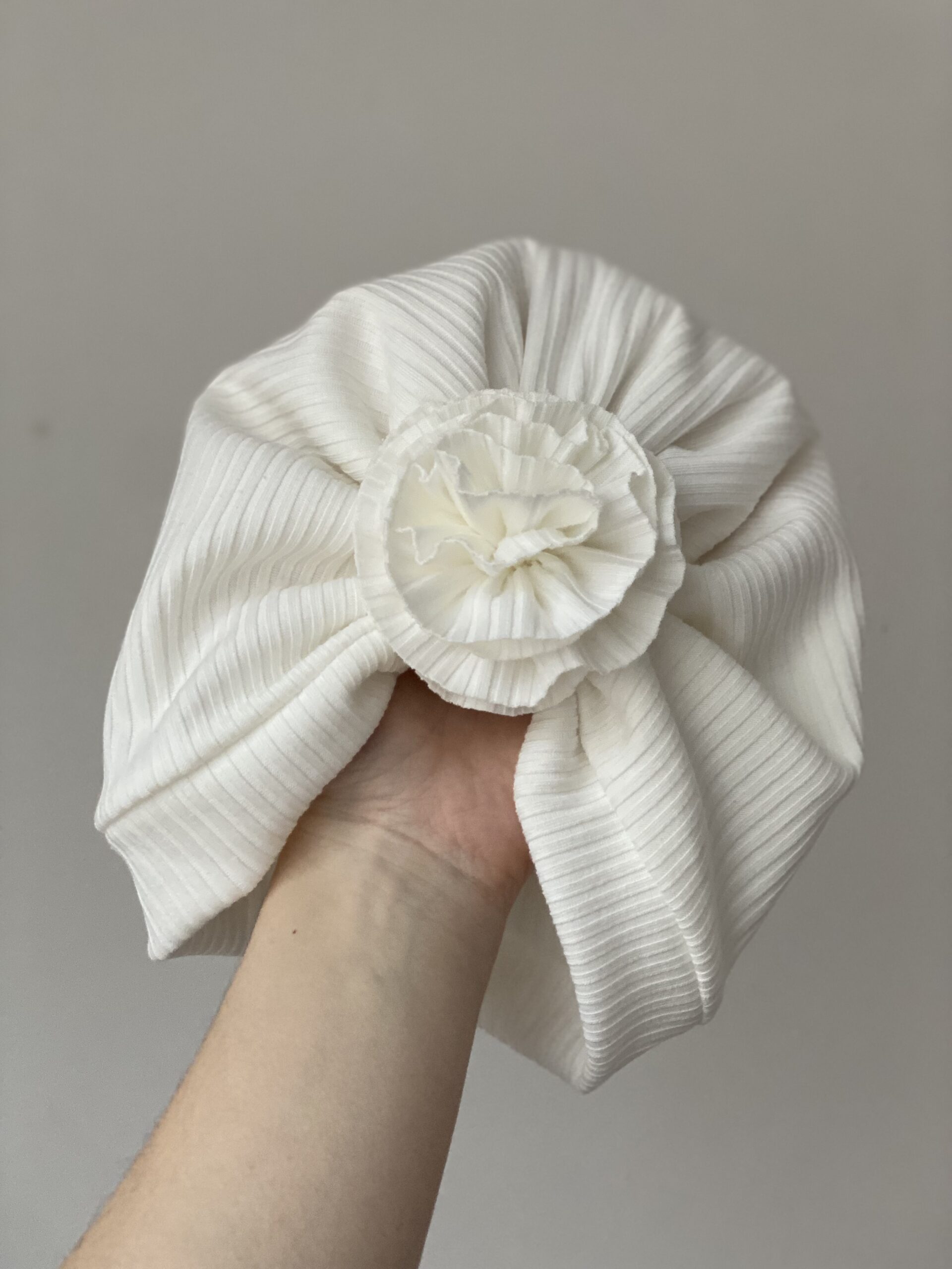 Будьте першим, хто залишив відгук “Чалма з квіточкою одношарова молочна в широкий рубчик”“
