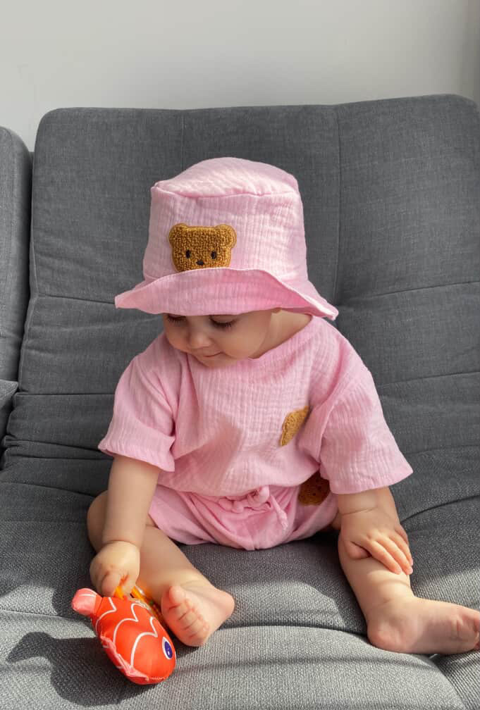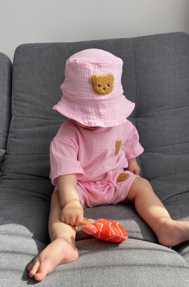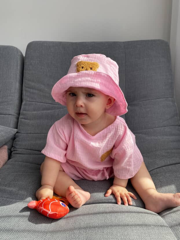 100% бавовна, ніжний преміальний муслін. За потрби можна доповнити панамкою в комплект.
