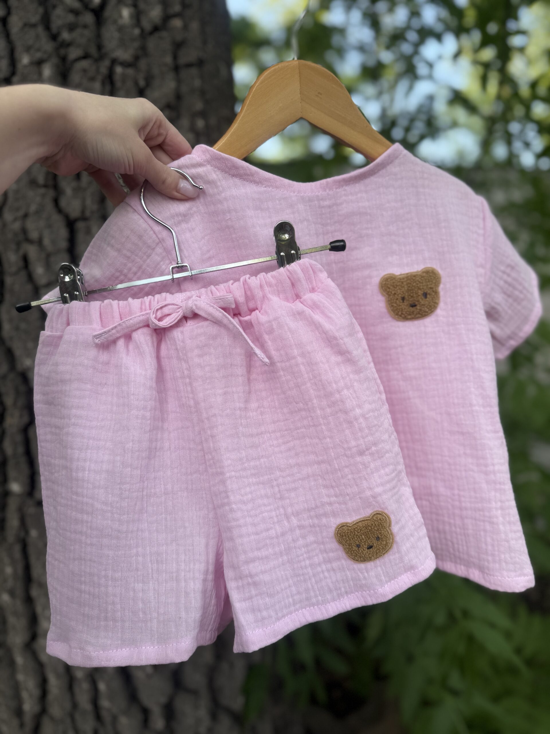 Будьте першим, хто залишив відгук “Костюм мусліновий рожевий шорти + футболка з ведмедиком Тедді”“