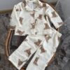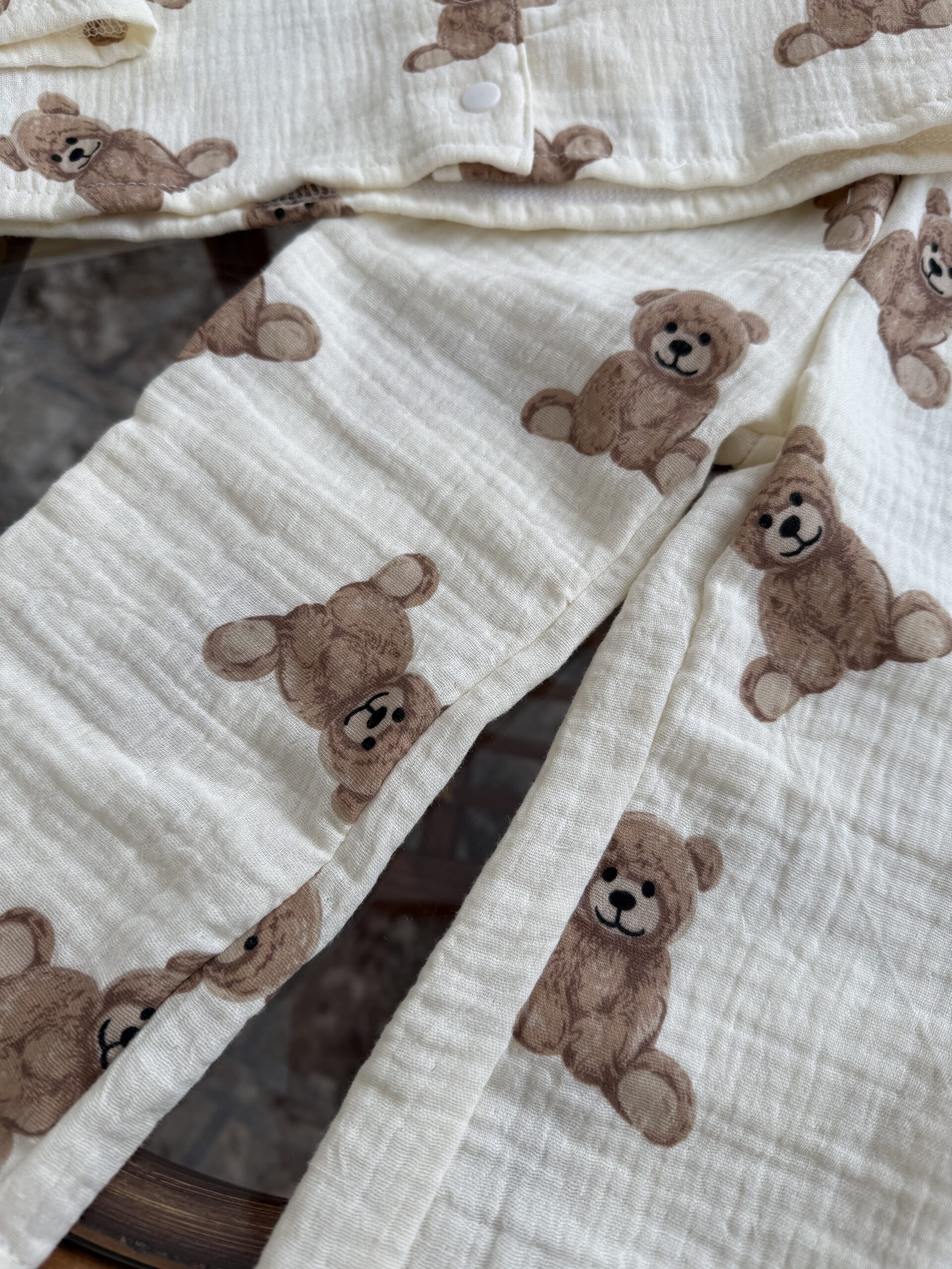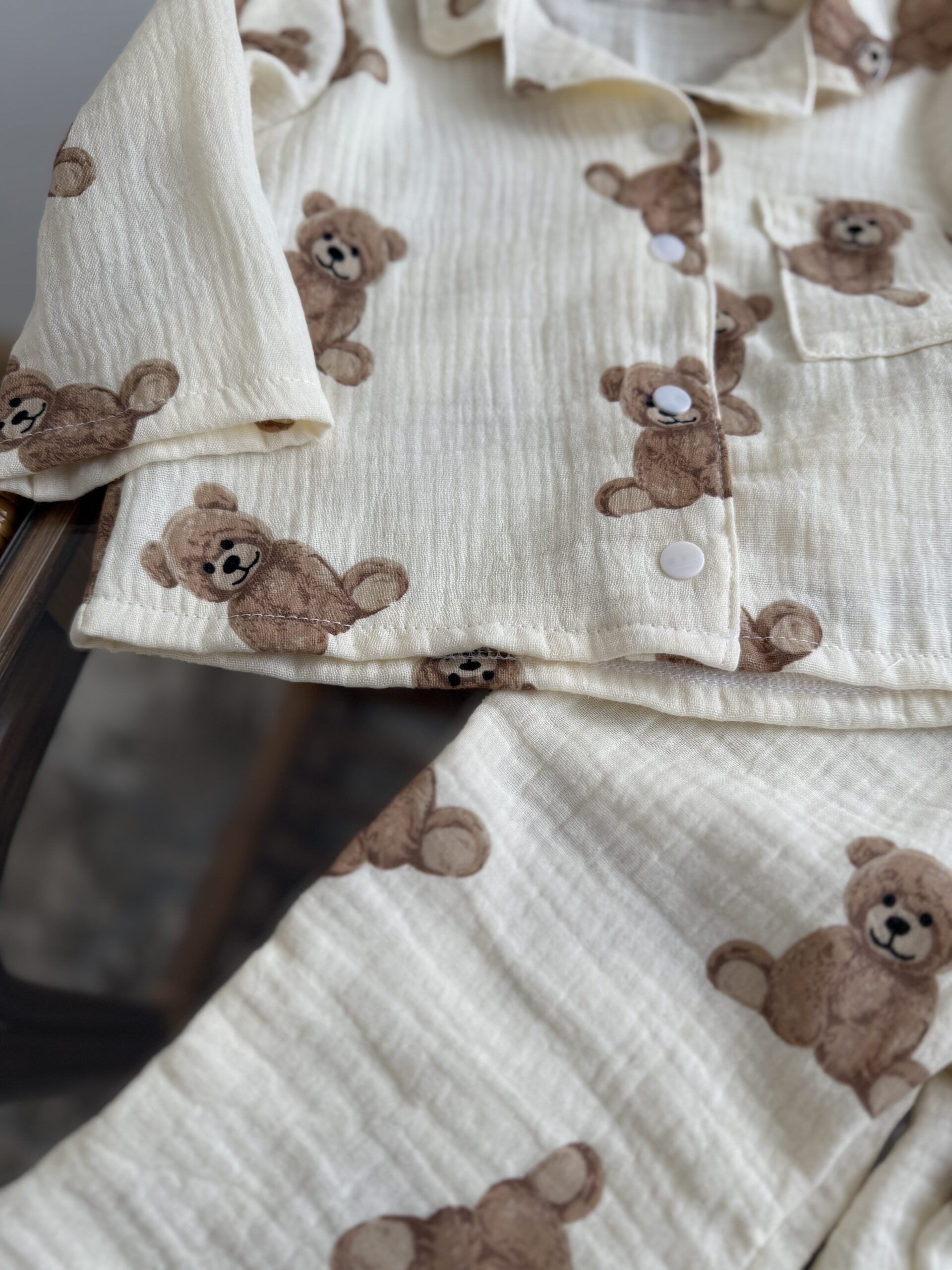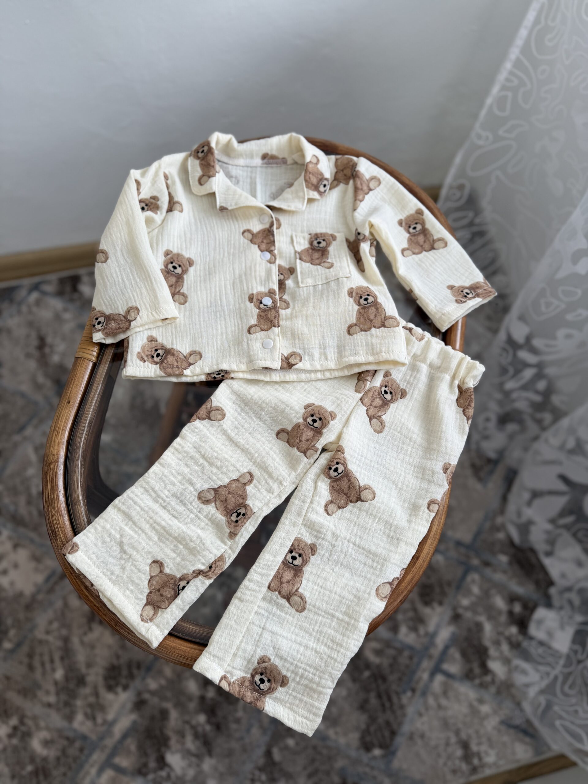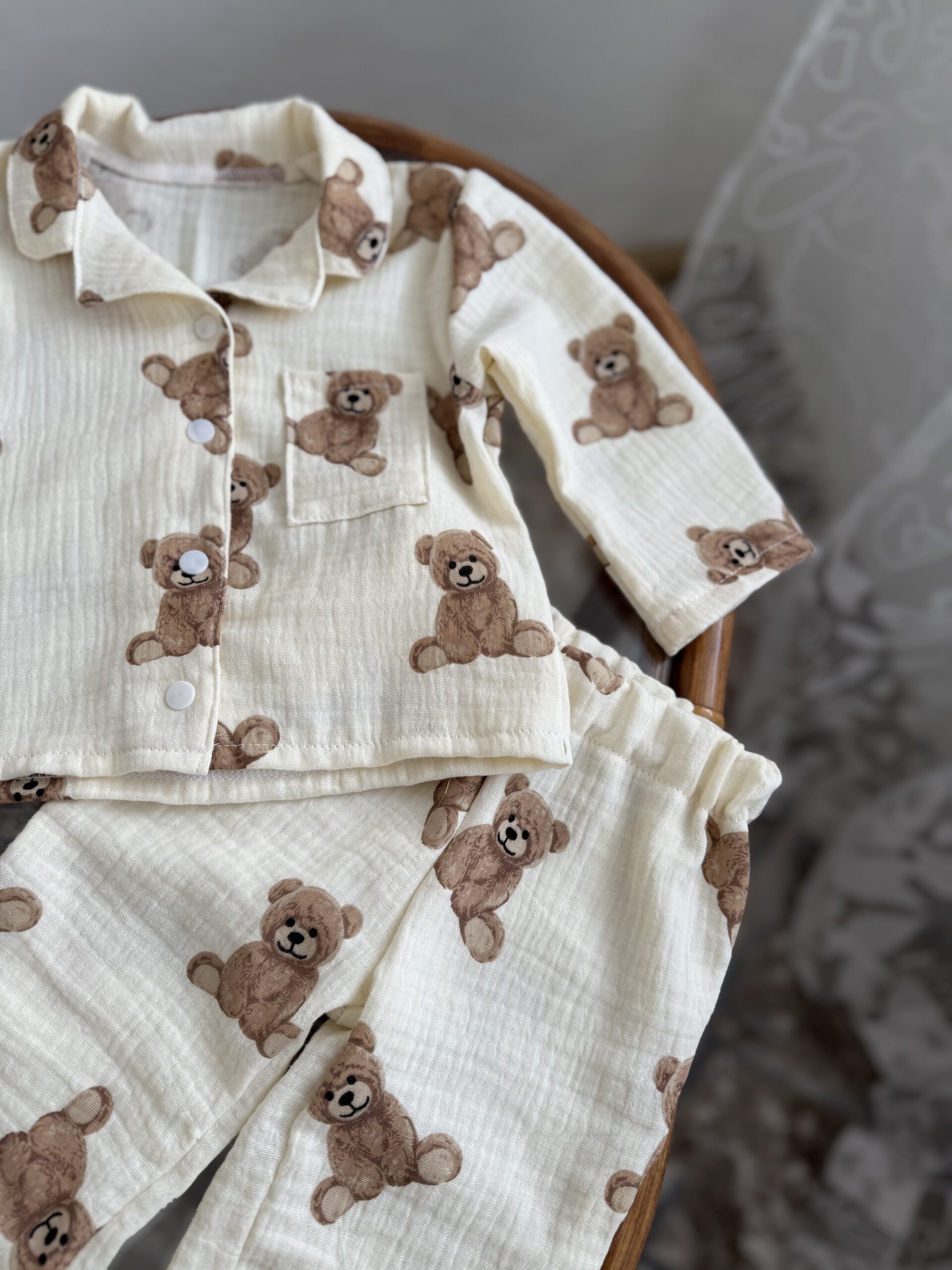 Піжама виготовлена з 100% бавовняного мусліну — легкої, повітряної тканини, яка чудово пропускає повітря та підходить для чутливої дитячої шкіри. Матеріал не парить, швидко висихає та стає ще м’якшим після прання.