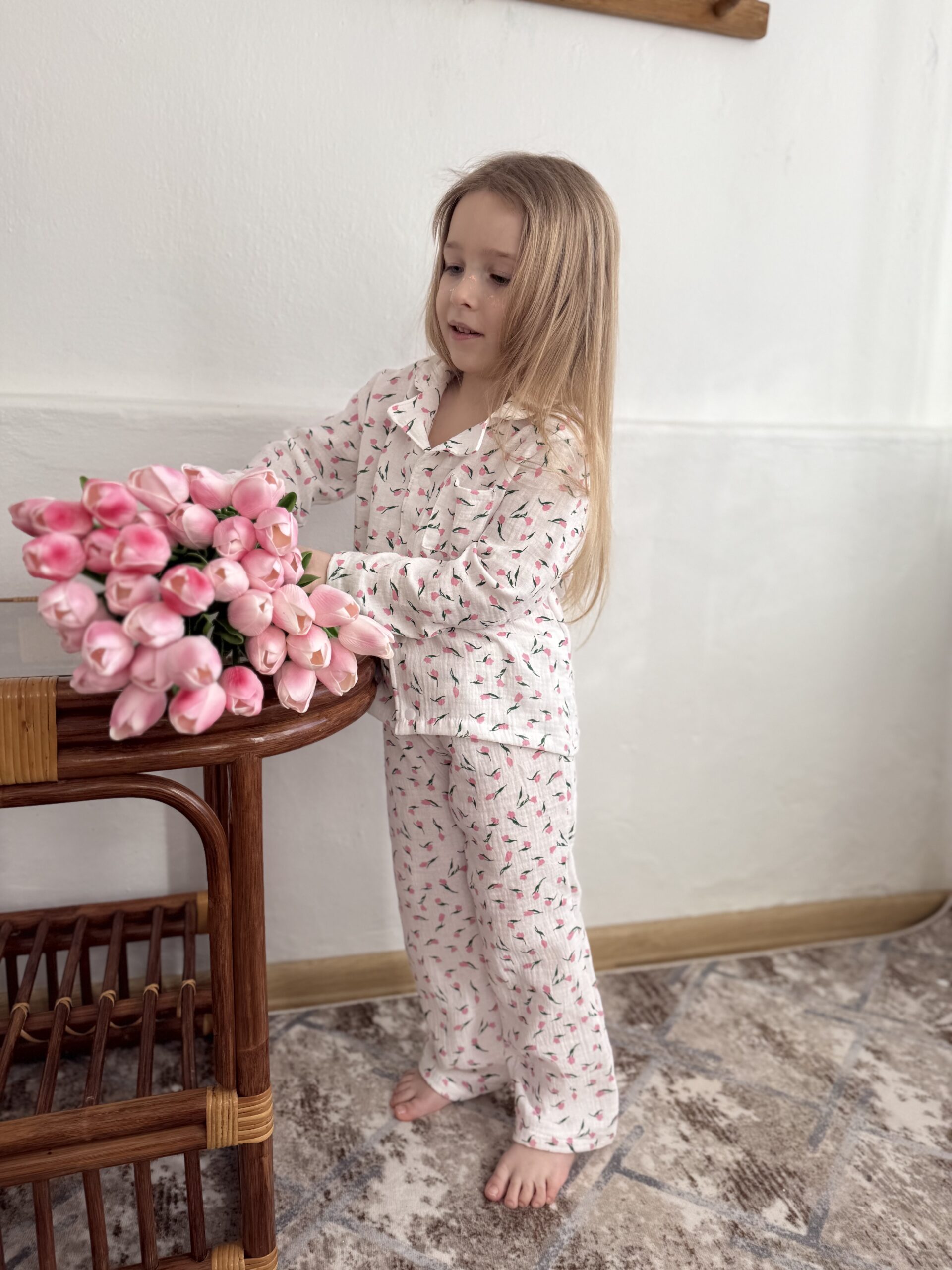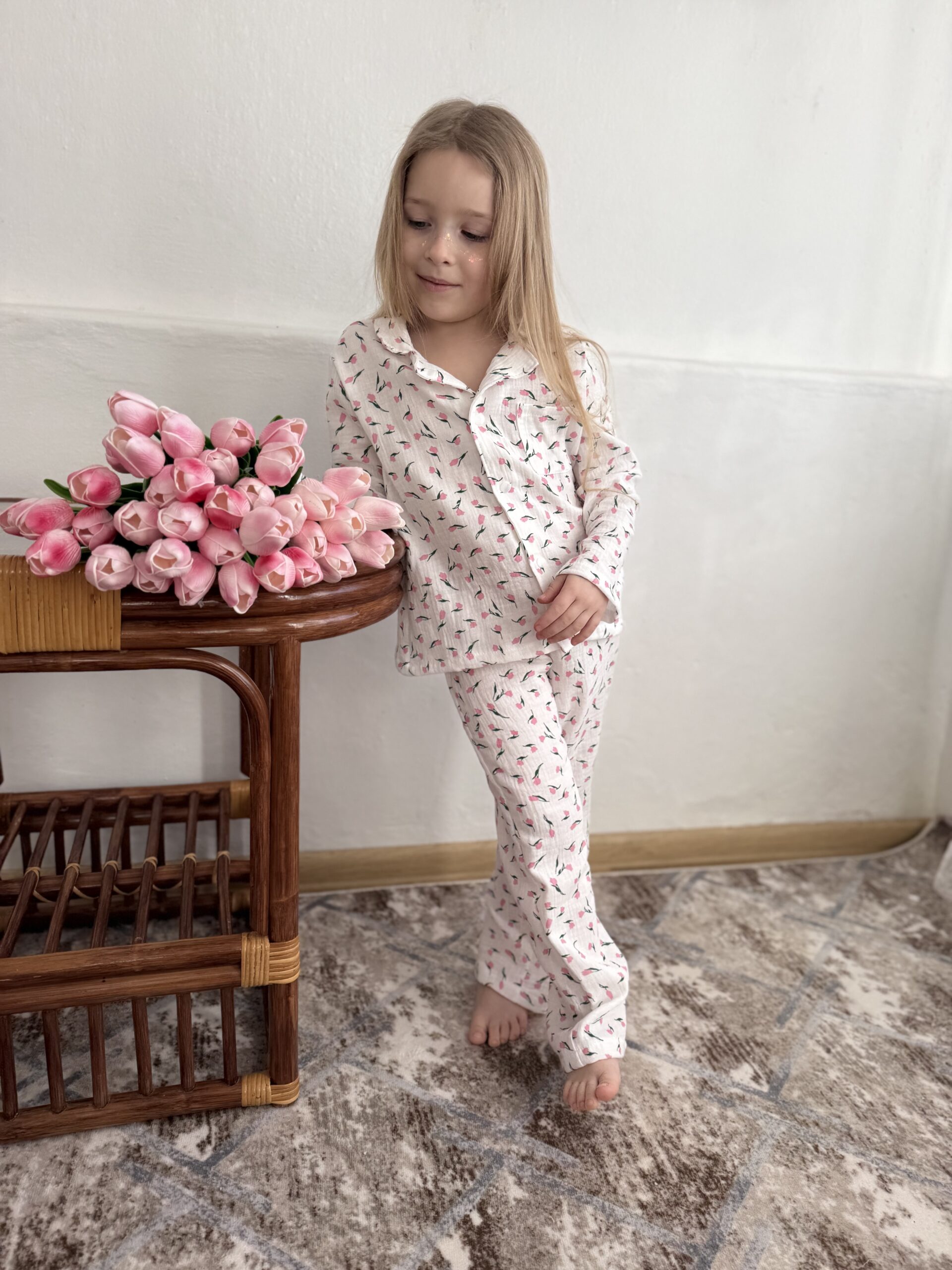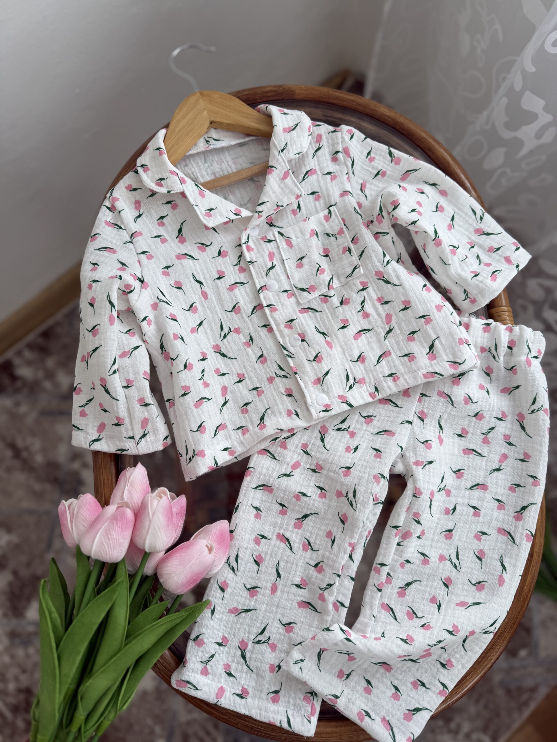 дитяча піжама з тюльпанами, муслінова піжама для дівчинки, квіткова дитяча піжама, літня піжама для дітей, натуральна бавовняна піжама, піжама для садочка, комплект для сну дитячий, український дитячий одяг