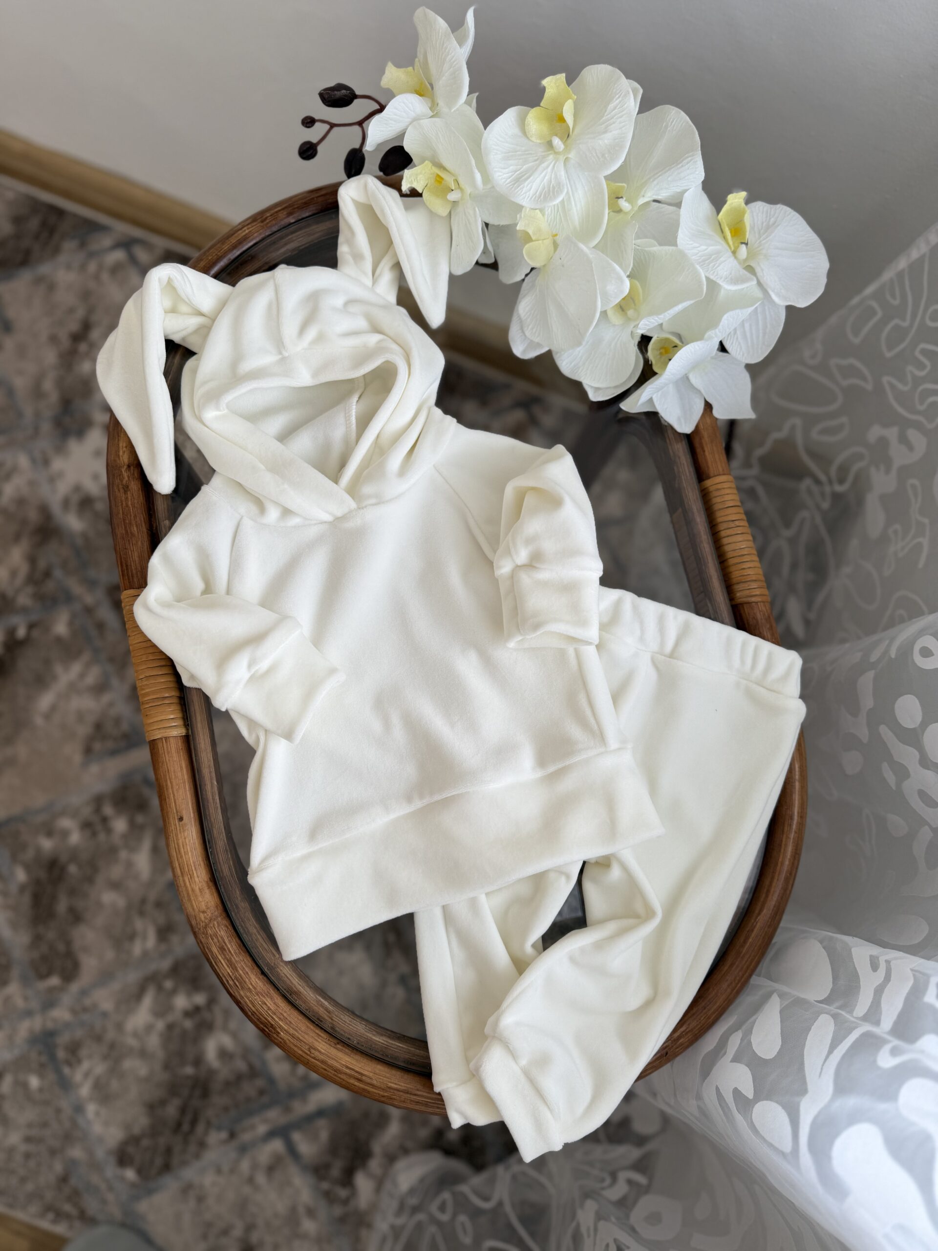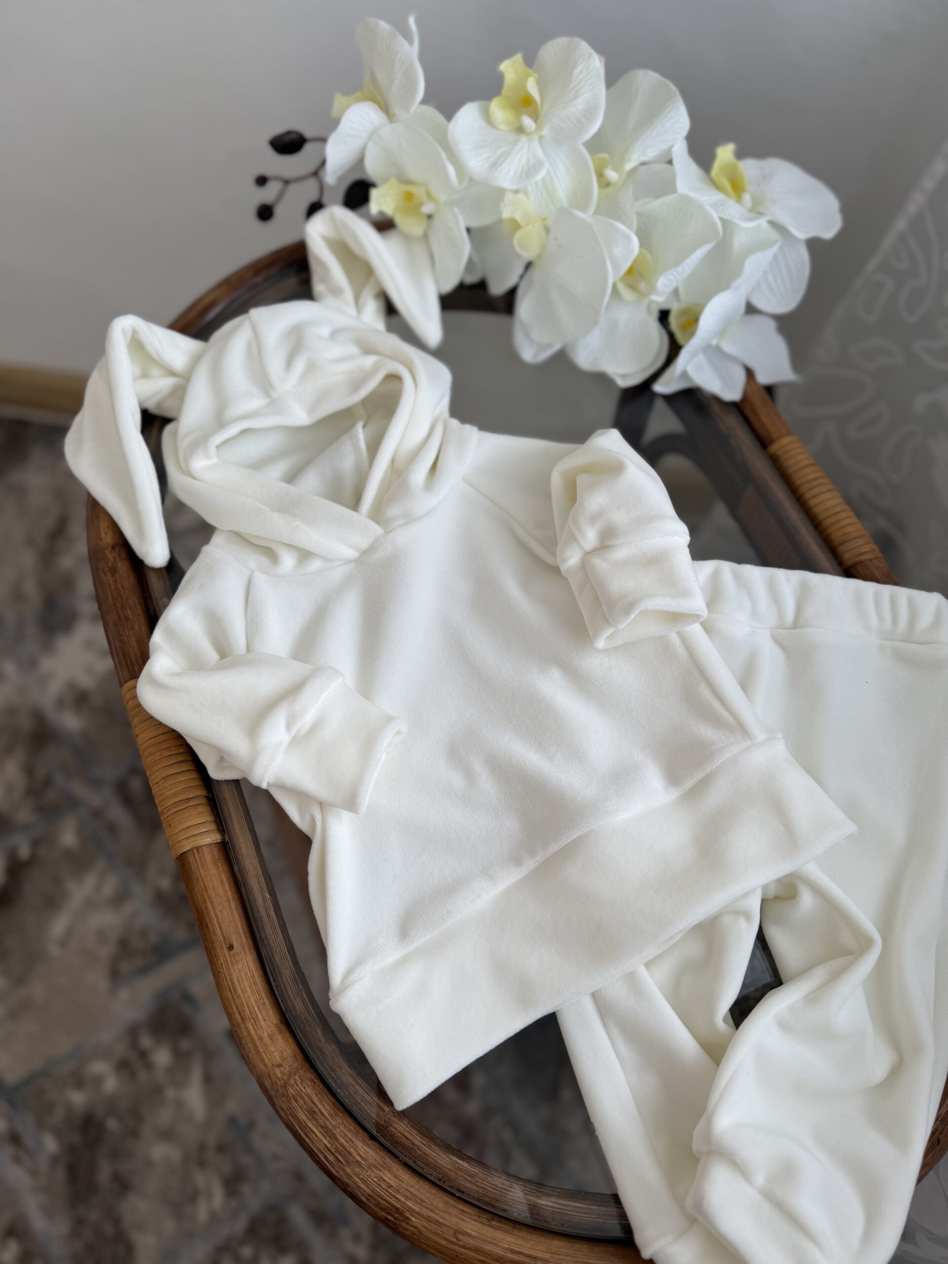 Ніжний, стильний і неймовірно милий — цей оксамитовий костюмчик з вушками зайчика створений для найтепліших обіймів і затишних прогулянок