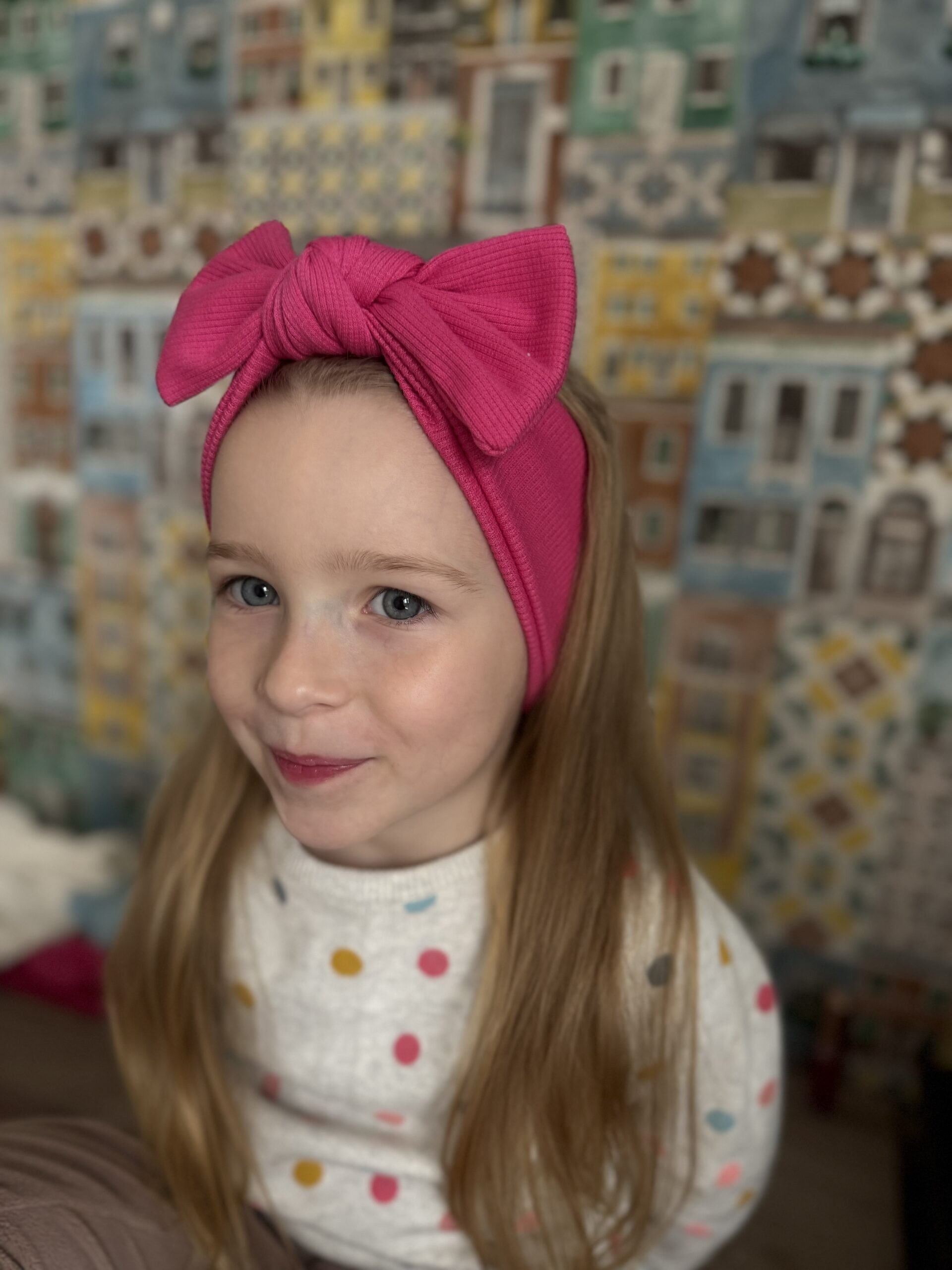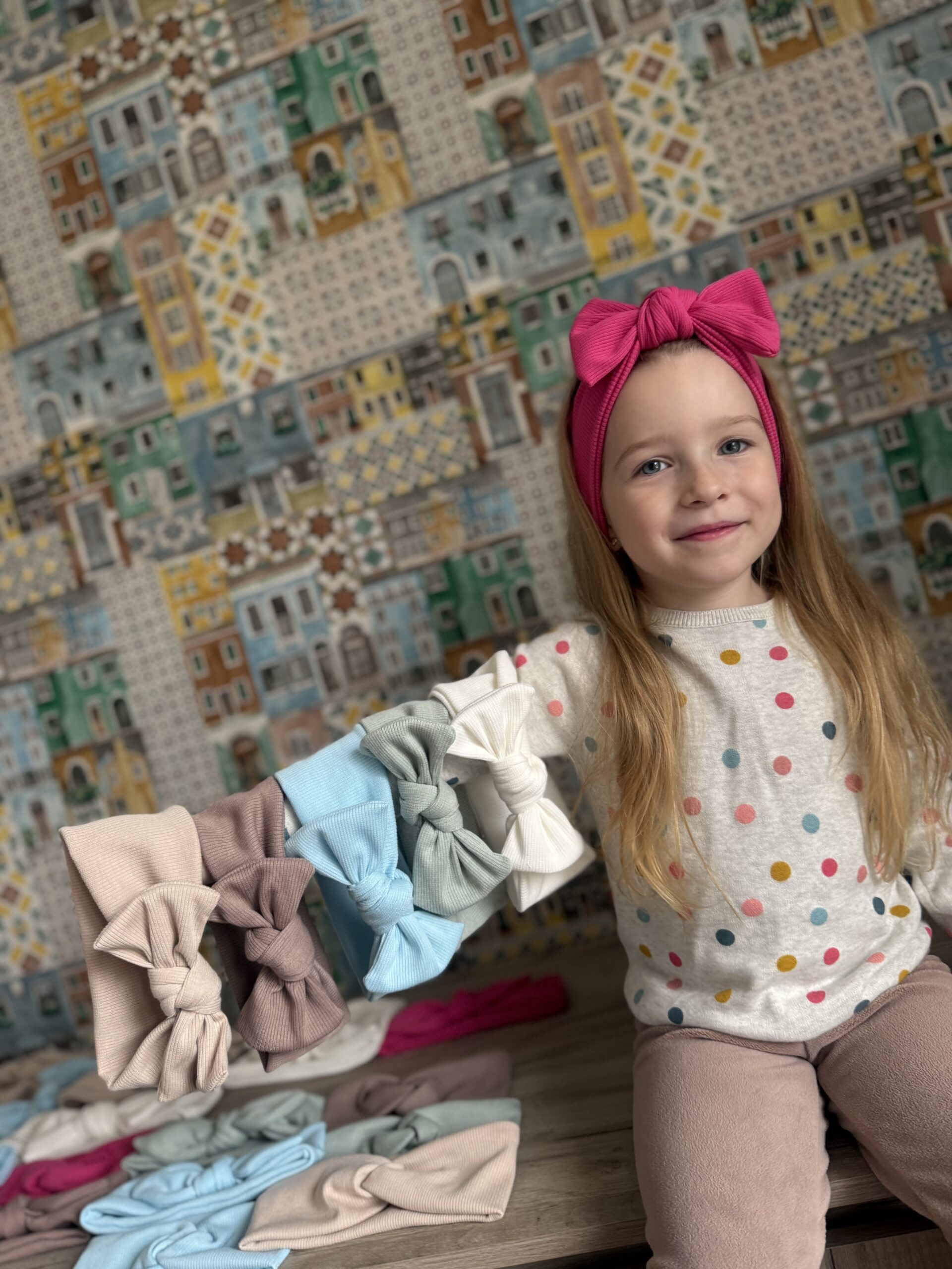 Пов’язка підходить для різного віку — від новонароджених до старших діток, легко підлаштовується під об’єм голови та виглядає охайно протягом усього дня.