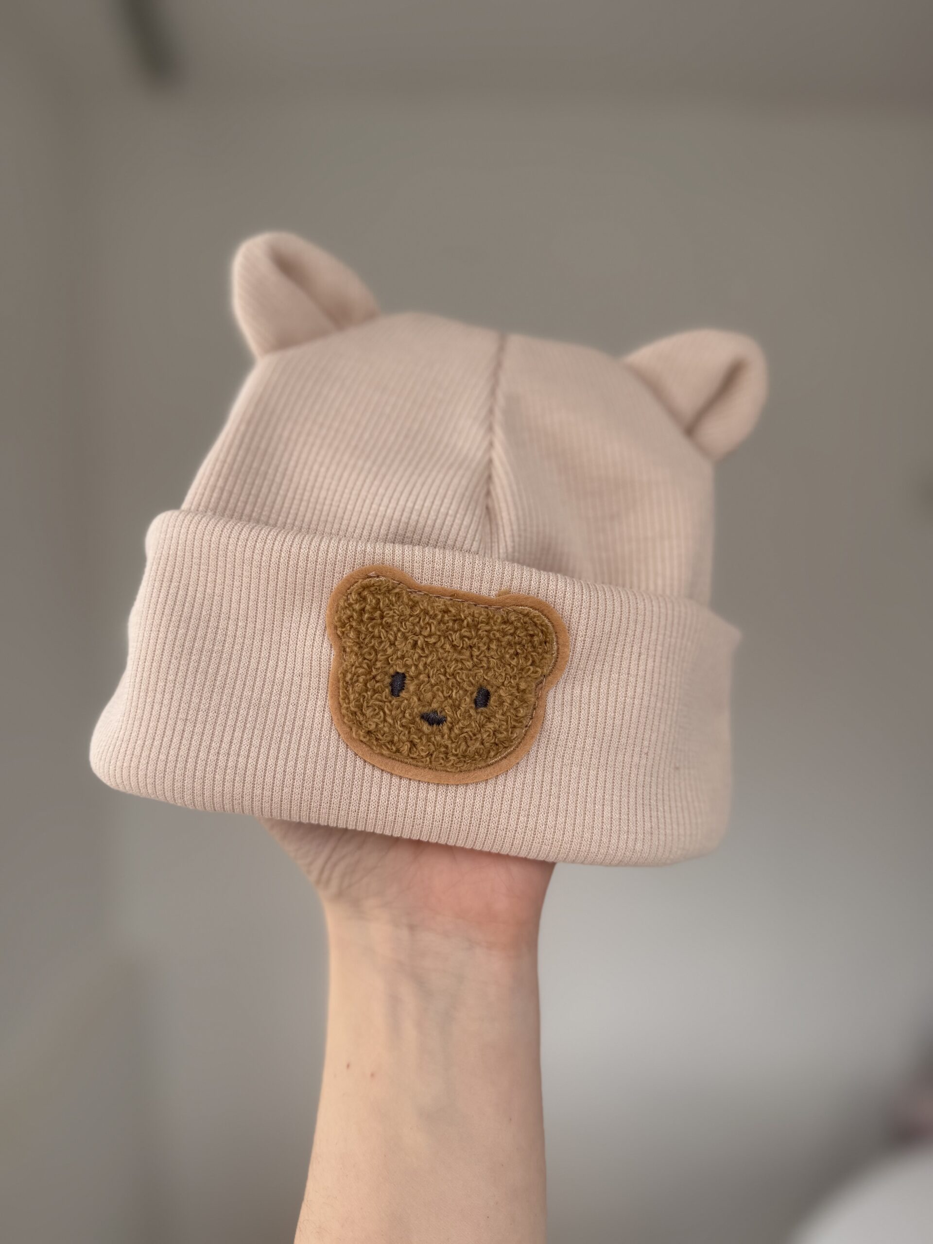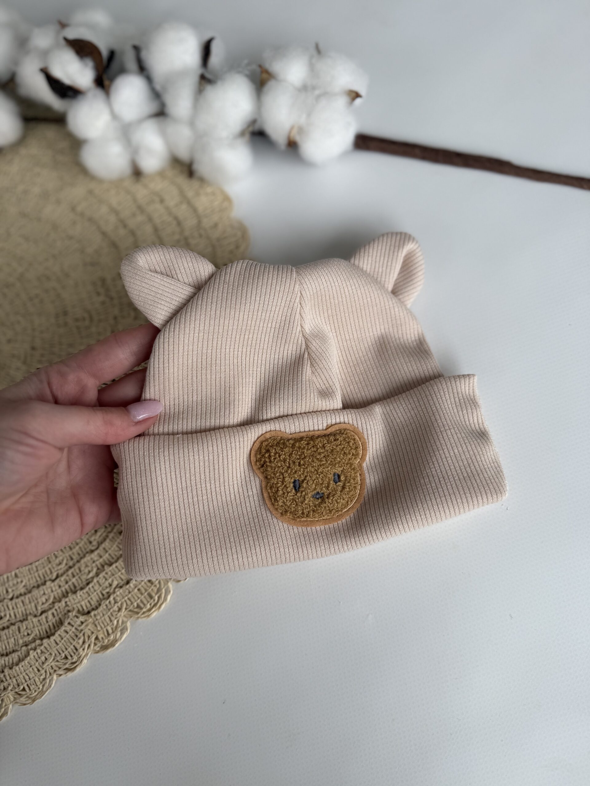 Шапочка біні беж в мілкий рубчик з вушками + ведмедик