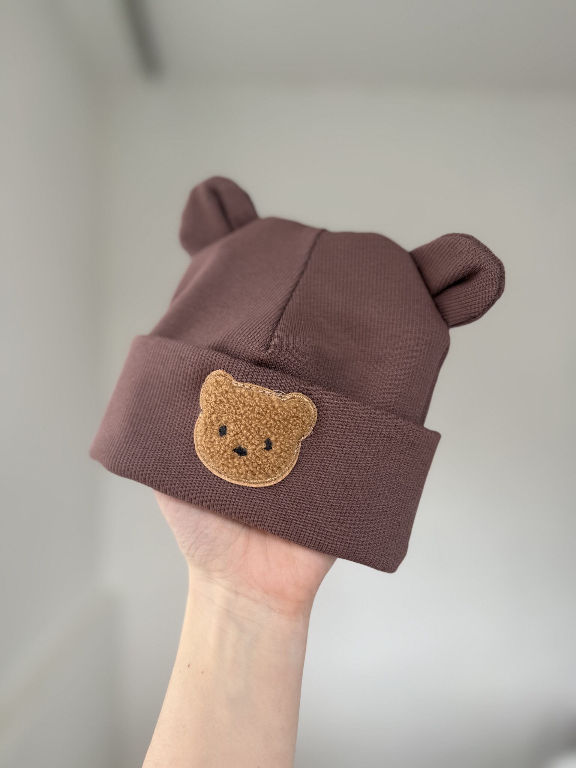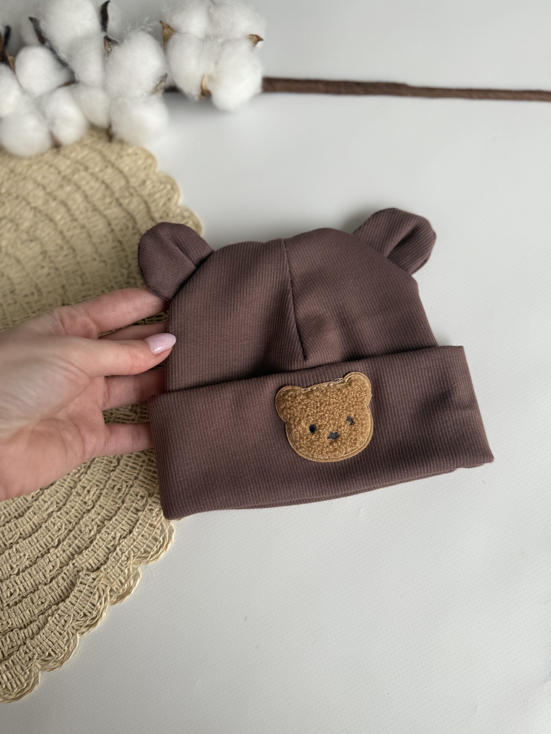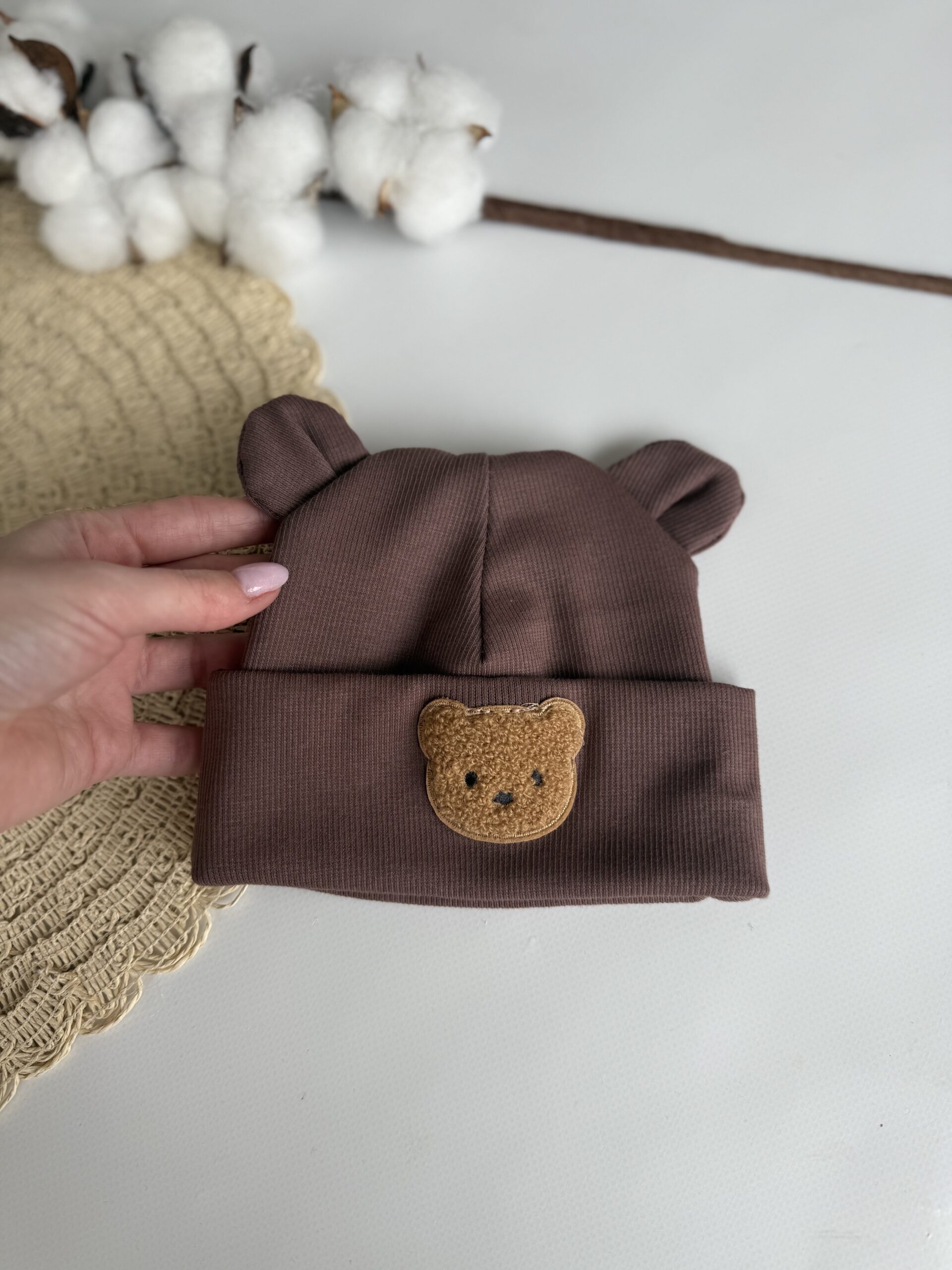 Шапочка біні мокко в мілкий рубчик з вушками + ведмедик