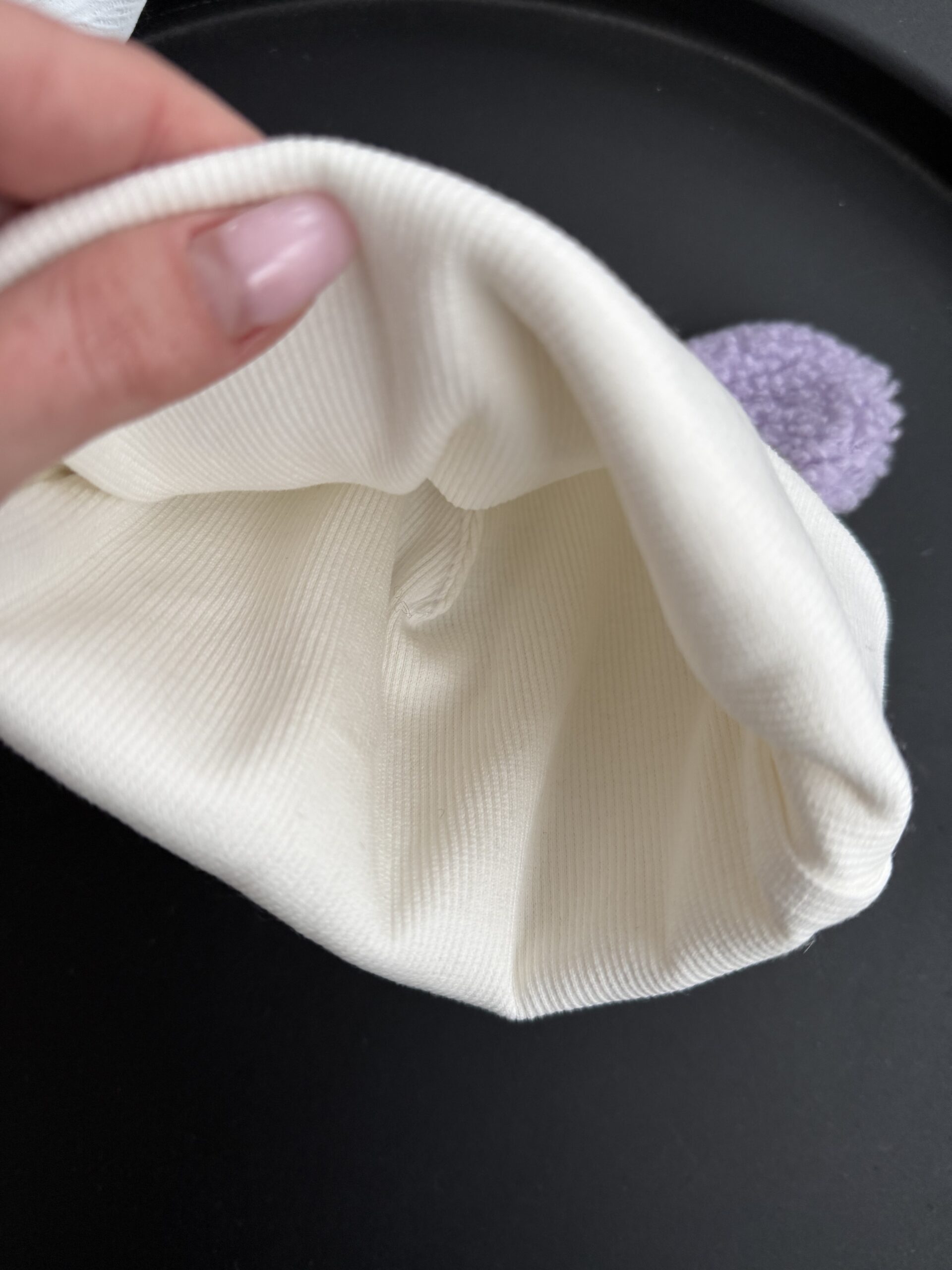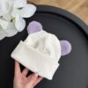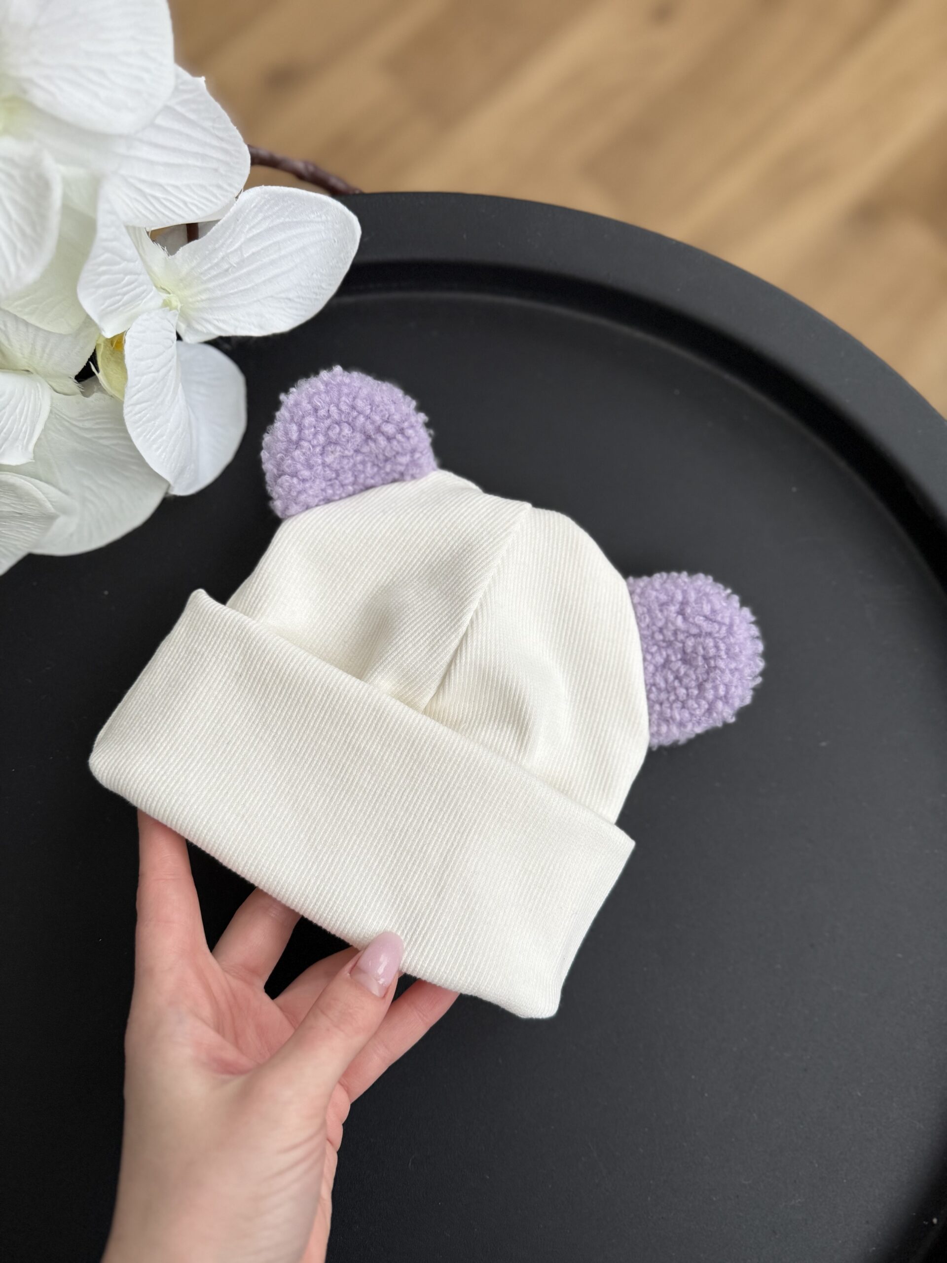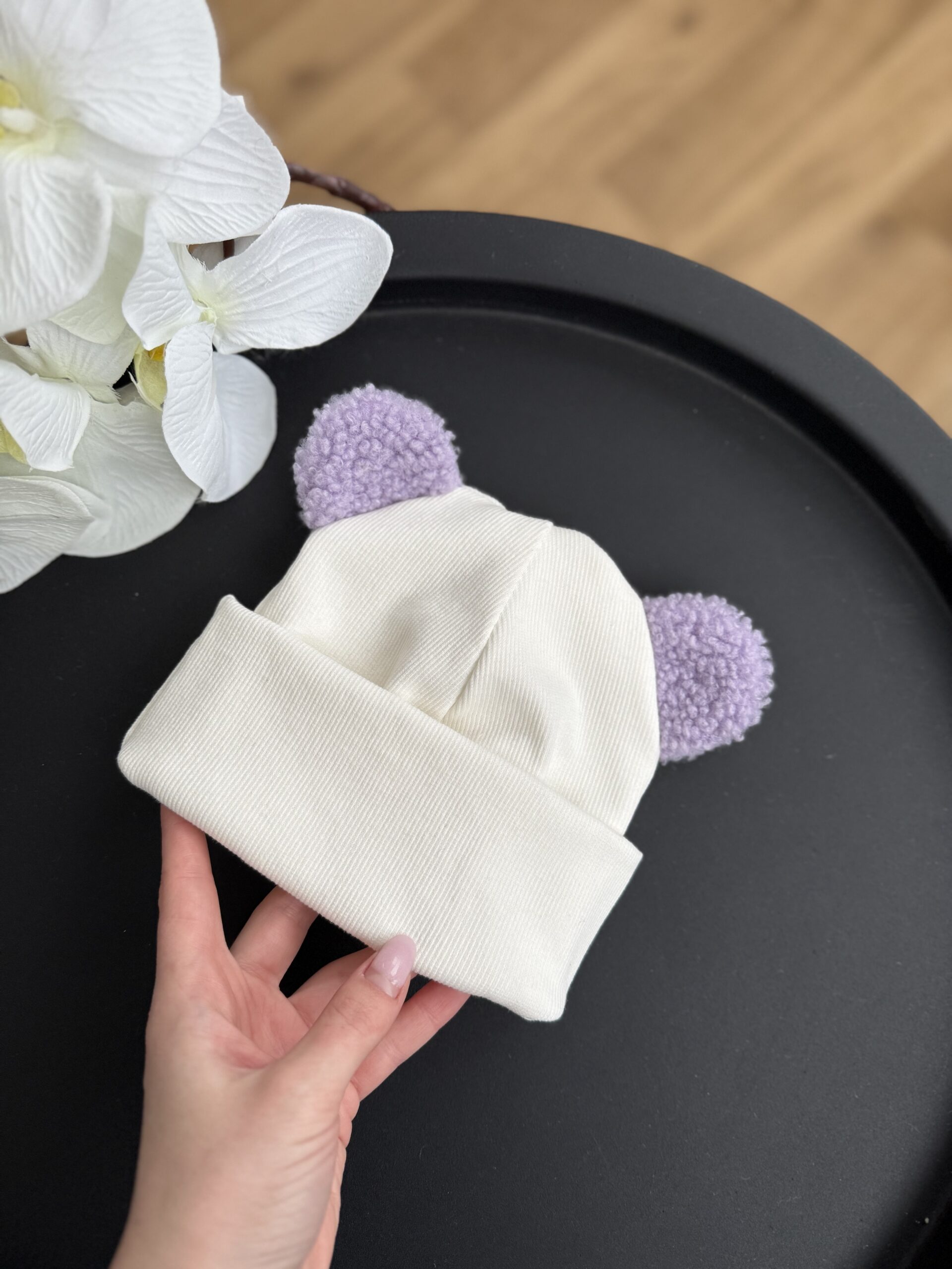 Шапочка біні молочна + вушка Тедді лаванда