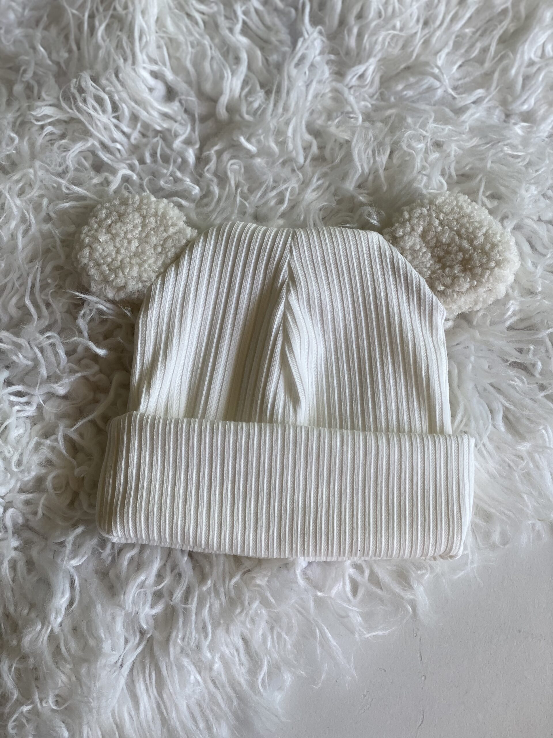 Будьте першим, хто залишив відгук “Шапочка біні молочна з вушками тедді молочні широкий рубчик”“